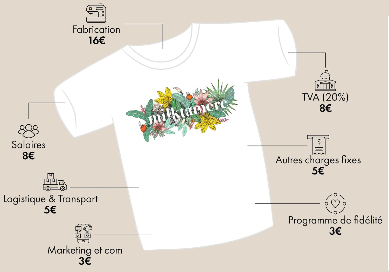 Et parce que la transparence fait partie de notre engagement, on tenait à vous montrer ici comment se répartit concrètement le prix d’un T-shirt Tajinebanane.