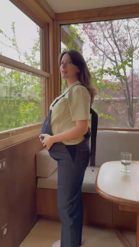 Dans un denim très souple, cette salopette est conçue pour suivre l'évolution de la grossesse : une ceinture qui se place sous le ventre, 2 empiècements côtés à boutonner ou non et des bretelles réglables.